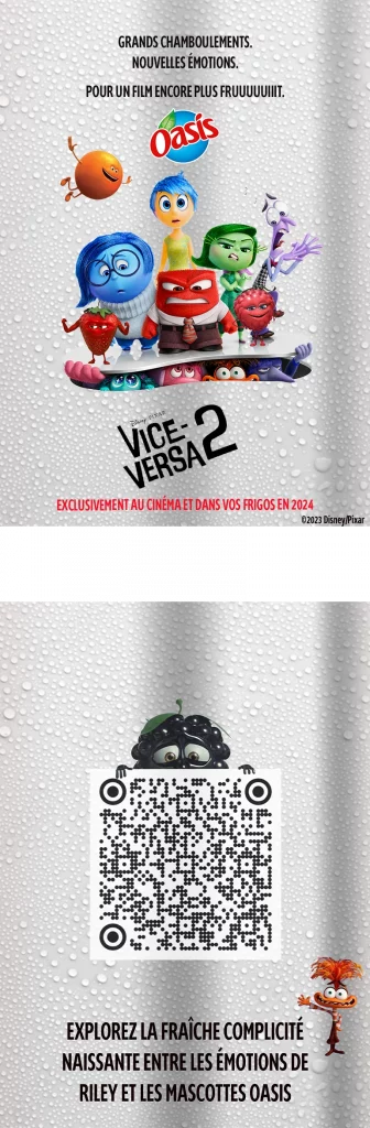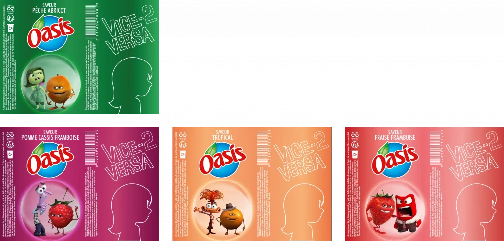 Nous avons choisi de mélanger l’univers décalé et fruité des canettes Oasis avec la sortie du film Vice-Versa 2. Ce choix s’est imposé naturellement, les deux marques partageant un ton humoristique et des personnages colorés aux personnalités marquées.