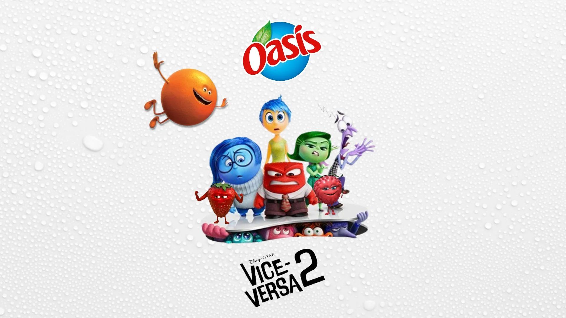 L’image donne une impression de double monde, celui des émotions de Vice-Versa 2 et celui des mascottes Oasis, illustrant la collaboration.